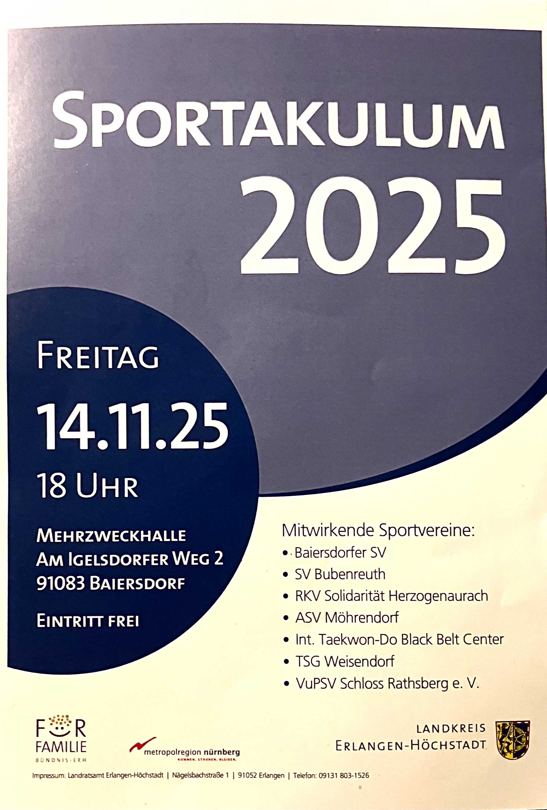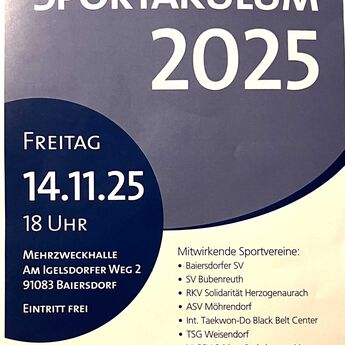 Am 14. November 2025 findet das Sportakulum ERH in der Mehrzweckhalle (der Mittelschule), am Igelsdorfer Weg 2, Baiersdorf statt.