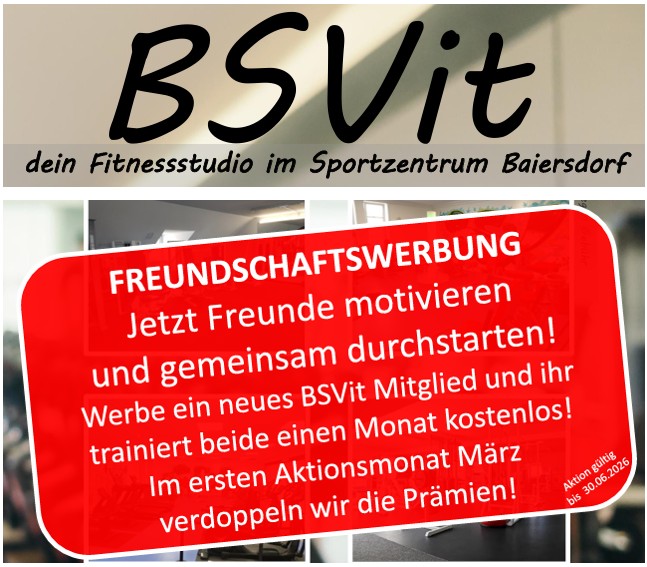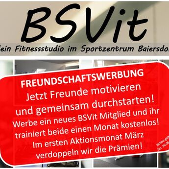Werbe ein neues BSVit-Mitglied und ihr trainiert beide einen Monat kostenfrei. Im Monat März 2026 verdoppeln wir die Prämie!