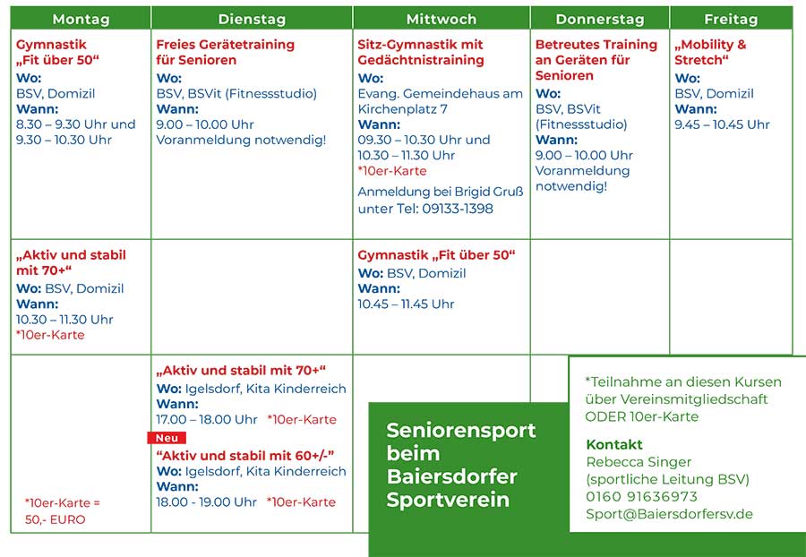 Der Baiersdorfer Sportverein bietet in einer Vielzahl unterschiedlicher Gruppen verschiedene Bewegungsangebote an. Unsere Angebote decken unterschiedliche Interessen und Bewegungstypen ab und sind allesamt auf die Zielgruppe ausgerichtet.